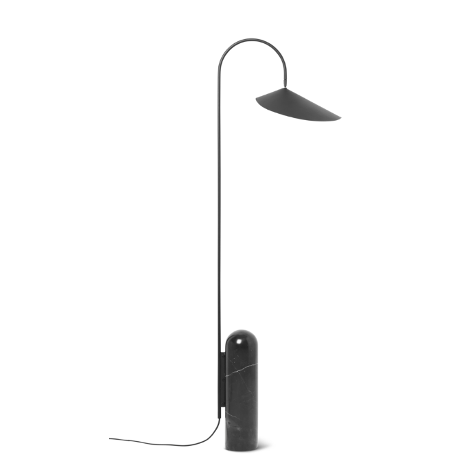 De Arum vloerlamp. van Ferm Living heeft een voet van massief marmer en een kantelbare kap van Powder Coated Steel met een Matte Off-white binnenkant. Het snoer is 2,6 meter lang.