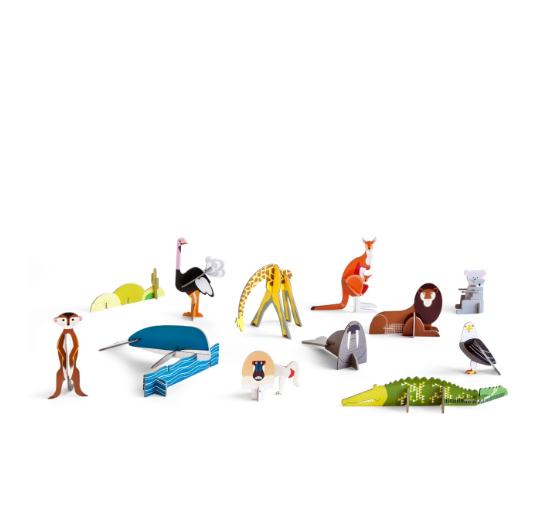Bouwpakket voor 3D kartonnen diertjes om mee te spelen.